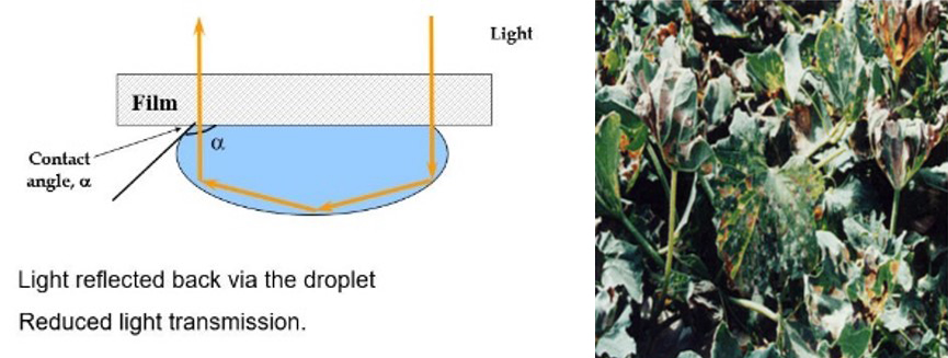• מתח פנים: נטייה של שטח הנוזל להתכווץ למינימום. מתח הפנים נמדד ביחידות של דין לס”מ. ההבדל בין מתח הפנים של מים (72 דין לס”מ) ובין מתח הפנים של פוליאתילן (31 דין לס”מ) או EVA (33 דין לס”מ) גורם להיווצרות טיפות. אלו מצטברות על פני שטח היריעה, גדלות, מתנתקות ממנה ונושרות.