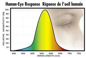 The human eye has a peak sensitivity in the yellow-green region, around 550 nanometers. Plants, on the other hand, respond more effectively to red light and to blue light, closer to the two extremities of the visible spectrum.The graphs below show the human eye response curve and the plant response curve. Note the vast difference in the contours.
