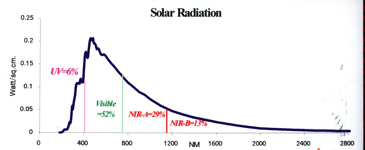 Solar radiation reaches the earth as a wide spectrum, 250 nm – 2800 nm. As can be seen in the following chart, this spectrum can be divided to three major ranges: