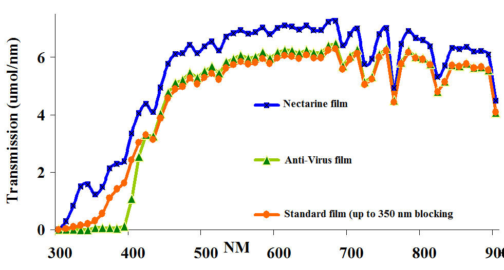 b. Plants: In plastic ilm the UV irradiation transmission can be controlled depending on the additives that is used, it’s possible to block the UV irradiation up to 380 nm totally as in anti-virus or anti-blackening films, semi-blocking films up to 350 nm or UV opened films with the highest transmission at the range.