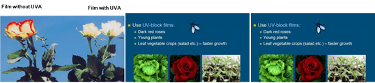 More phenomena related to UV: UV is essential for the development of some colors and fragments in flowers, vegetables and fruits. On the other hand, blocking the UV suppresses activity of insects (Anti-Virus) as well as helping enhance film stabilization. UV blocking is needed while growing red roses. Some fungus species need UV light to trigger sporulation; hence, UV Blocking will slow down this process.