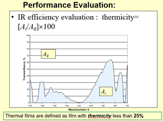 Measuring IR range is done by FTIR. Thermicity is defined by the percentage of IR goes through the film ranging from 1400 cm-1 to 700 cm-1.