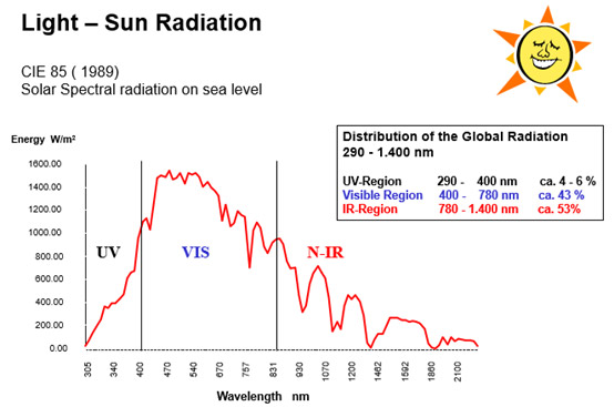 UV ranges from 100 nm to 400 nm. The Ozone layer absorbs the short-wave part up to 290 nm. The UV range – although it is only 6% of the total radiation – is highly energetic and may cause film degradation.